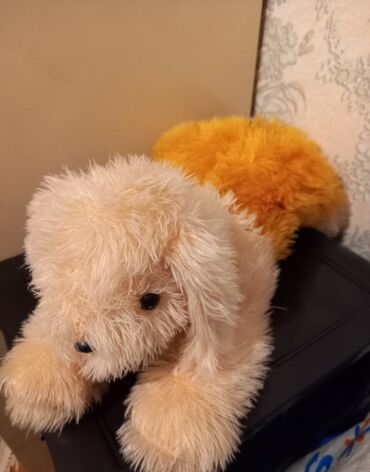 - Krem rəngli it fiqurlu plyuş oyuncaq: uzun tüklü tekstura, qara muncuq gözlər, yumşaq burun, uzanmış poza. Quyruq hissəsi narıncı-sarı tonlardadır.