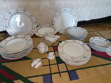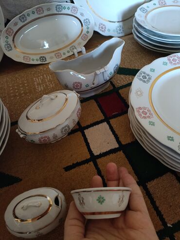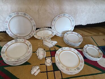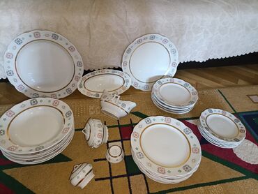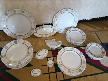 Zərif naxışlı və bəzək daşları ilə işlənmiş porselen süfrə-servis dəsti. Xüsusiyyətlər: - Rəng: ağ, gümüşü xətt və ornamentlərlə, parlaq dekorativ daşlarla - Material: incə porselen - Dizayn: dalğ...