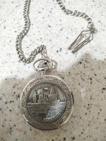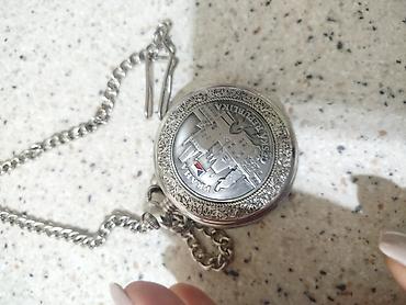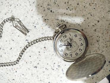 Kiseli cib saatı və zəncir - Qapaqlı cib saatı, metal korpus - Ön qapaq açılan mexanizmli, daxildə həndəsi naxışlı - Parlaq qırmızı siferblat, ağ rəqəmlər və iki əqrəb - Saat 12 mövqeyində kiçik s...
