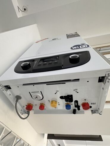- Aşağı hissədə rənglə kodlaşdırılmış giriş-çıxış portları (qaz, soyuq/isti su, istilik xətti)