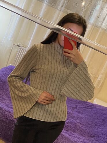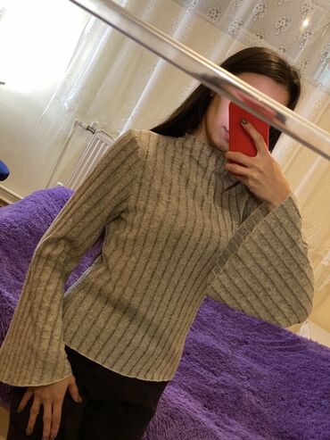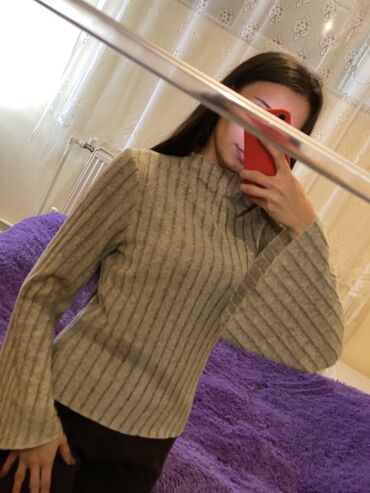 Boz rəngli qadın sviteri - Model: uzunqol, qısa boğazlı (yarım balaklava tipli) trikotaj sviter - Rəng: neytral açıq-boz - Material: yumşaq, nazik toxuma; elastik ətək və qol manjetləri - Dizayn d...