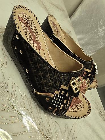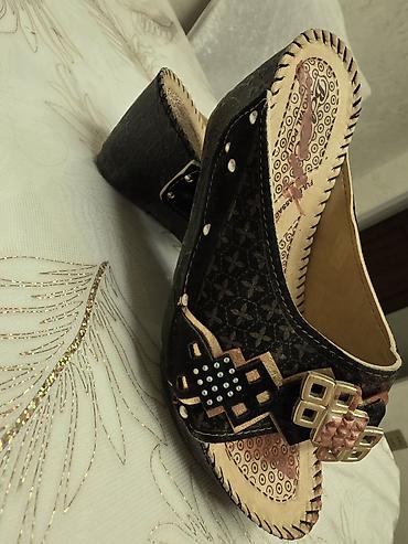 - Model 3: Etnik motivli taxta effektli platforma çəpik (slayd). Qara fon üzərində naxışlı üst hissə, yanlardan metal pərçimlər, üstdə dekorativ elementlər və kiçik daş aplikasiyası. Açıq burun, rahat daban hündürlüyü.