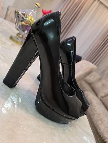 - Model 2: Qara rəngli, parlaq laklı platformalı hündürdaban ayaqqabı. Kəskin burun xətti, yüksəklik verən qaba platforma, stabil qalın daban. Gecə dəstləri və şıq ofis geyimləri ilə uyğunlaşır.