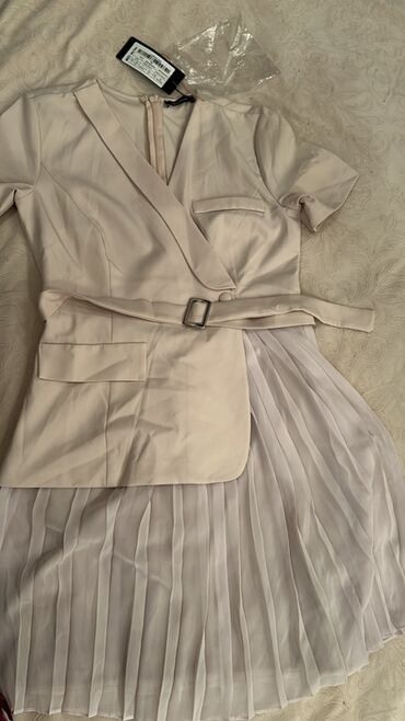 Zərif bej rəngdə qadın geyimi – blazer üslublu üst və pliseli ətək kombinasiyası.