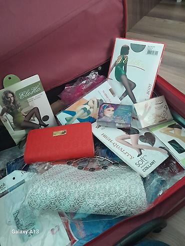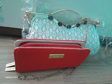 - Zərif dizaynlı, ağ rəngdə krujeva naxışlı əl çantası: qızılı metal çərçivə və qulplar, üzərində mavi daşlı bəzək; çiyin üçün incə metal zəncir qayışı daxildir. Daxili hissə bir neçə bölmə ilə təşkil olunub, makiyaj, telefon və xırda aksesuarlar üçün uyğundur. Axşam dəvətləri və xüsusi günlər üçün elegant görünüş.