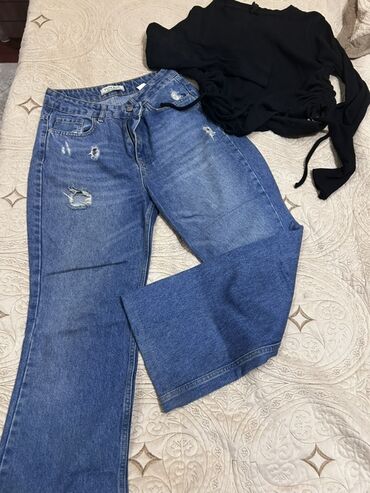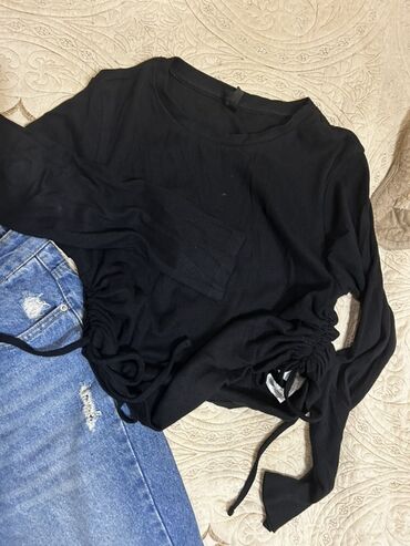 İki hissəli qadın geyim dəsti - Üst: Açıq mavi, uzunqollu bluz. Klassik qatlana bilən yaxa və ön hissədə büzgülü/volanlı düymə detallarına malikdir. Qısaldılmış (cropped) kəsim, elastik ətək xətti...