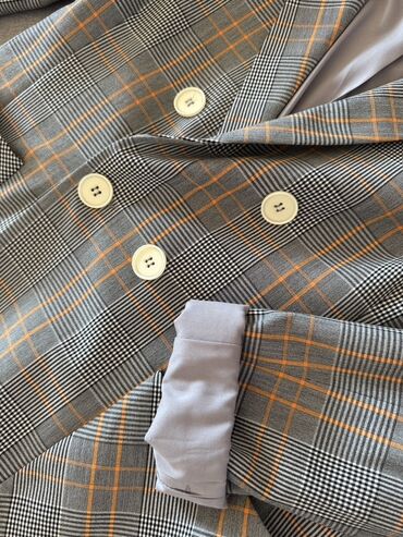 Qadın dəbli blazer - Rəng və naxış: Boz rəngli, xırda qara-çəhrayı xətli qəfəs (plaid) naxış. - Model: İkiqat düyməli (double-breasted), enli yaka (peaked lapel). - İçlik: Xardal-sarı atlas astar;...