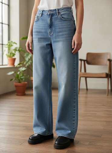 - Rəng: açıq-mavi/solğun “stone wash” effektli denim