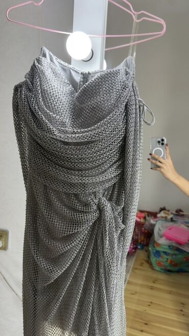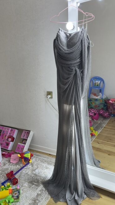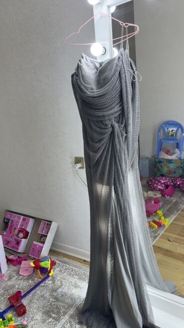 1 dəfə geyinilib. Məhsul: Parıltılı axşam/gecə libası - Rəng: Tünd boz–gümüşü tonlarda, tam səthdə sıx parıltı effektli - Model: Uzun, A-kesimli ətək; beldən yüngül yığımlı, fiquru vurğulayan silu...