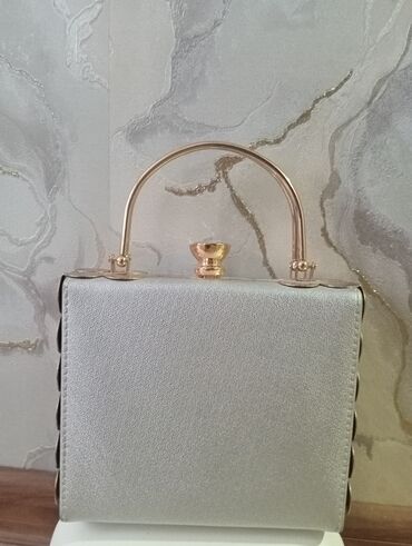 Zərif axşam çantası/klaç - Forma: oval, sərt korpus - Rəng: gümüşü (parıltılı, mikro-şinillərlə) - Qapanma: üst hissədə qızılı rəngdə bant (kəpənək formalı) kilid - Tutacaq: çıxarıla bilən qızılı ...