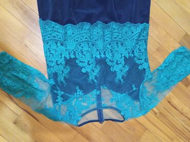 Zərif krujeva bəzəkləri və şəffaf detallar sayəsində bədənə oturan, diqqətçəkən görünüş yaradır. Lacivərt-firuzəyi kontrastı paltara klassik və modern harmoniya verir.