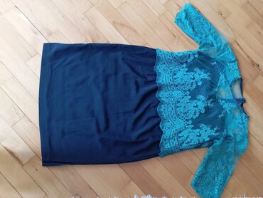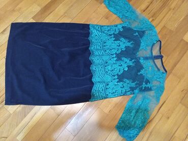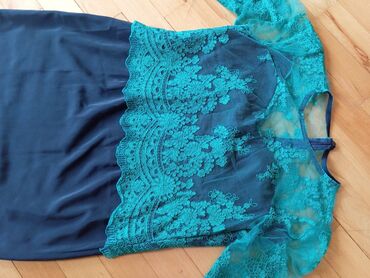 EndirimsizZərif qadın paltarı – lacivərt əsaslı, firuzəyi krujeva detallı.
