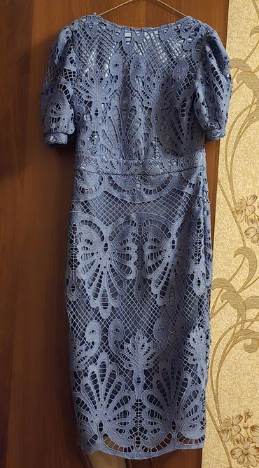 Mavi rəngli, qısaqol, V-yaxa ziyafət donu. Donun ətəyi tül qatlıdır və dizdən aşağı uzanır. Üst hissəsi incə naxışlı, krujeva detallı parçadan hazırlanmışdır. Qapalı kürək hissəsi və qısa qolları i...