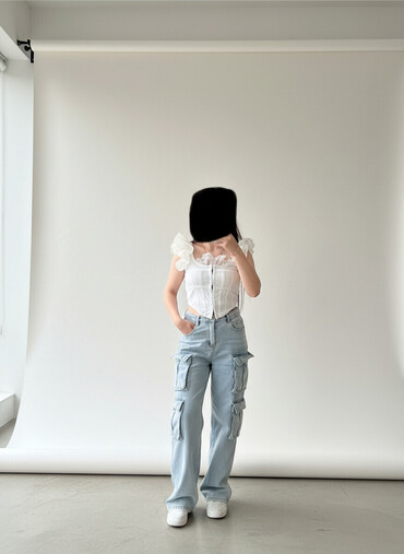 Ağ rəngli, düz kəsimli, qısaqol qadın bluzası. Bu bluzanın qolları volanlı dizayna malikdir. Sinə hissəsi korset tipli tikilişə sahibdir və ön tərəfdən fermuarla bağlanır. Bluzanın üst hissəsində, sinə və çiyin nahiyəsində naxışlı güpür detalları mövcuddur. Bu dizayn, bluzaya zərif və dəbli görünüş verir. Gündəlik geyim üçün uyğundur.