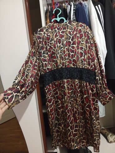 Qadın paltarı – leopard/sürünən naxışlı, qırmızı-qəhvəyi-bej tonlarda.