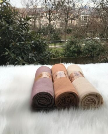 Qutuda/Setdə: Eyni seriyadan 3 yuvarlanmış şal, hər biri “Lüks Penye Şal” etiketli. Neutral palitra kapsul qarderobla asan uyğunlaşır.