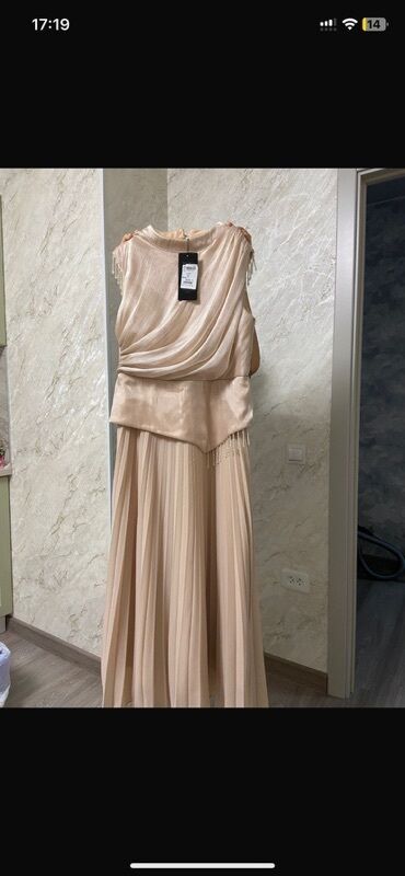 - Material: ipək-effektli hamar parça + axıcı, nazik pliseli şifon ətək