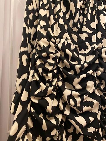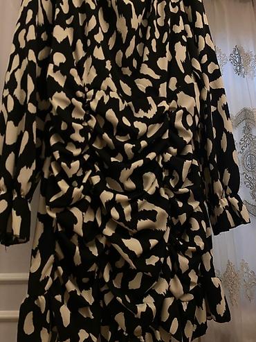 Şəkillərdə göstərilən asimmetrik, büzgülü, uzunqollu naxışlı mini don.