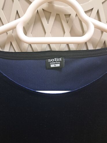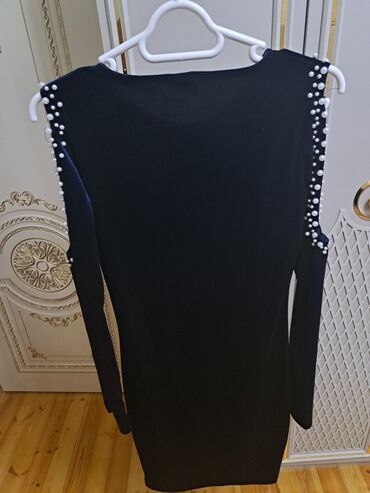 - Rəng: tünd göy (gecə mavisi) - Parça: yumşaq, zəngin toxumalı məxməri görünüş - Model: bədənə oturan, düz kəsim - Ölçü: S (etiketdə göstərilib) - Uzunluq: dizə yaxın midi - Yaxa: dairəvi - Qol: uzun - Dizayn detalları: hər iki çiyin boyunca və qol tikişləri boyunca dekorativ inci aplikasiyaları - Arxa-hissə: düyməsiz/fermuarsız, minimalist