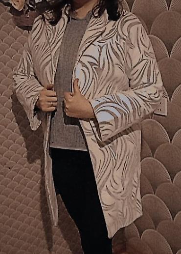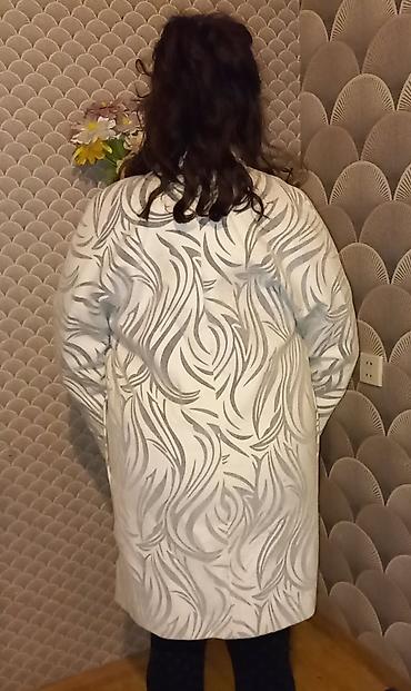 Modelarissa qadın palto – ağ rəng - Ölçü: 42 (etiketdə) - Stil: ikiqat düyməli, beldən oturan, klassik paça - Material: yumşaq toxumalı üst qat, iç hissəsi parıltılı, kapitonlu astar - Yaxa: geniş...