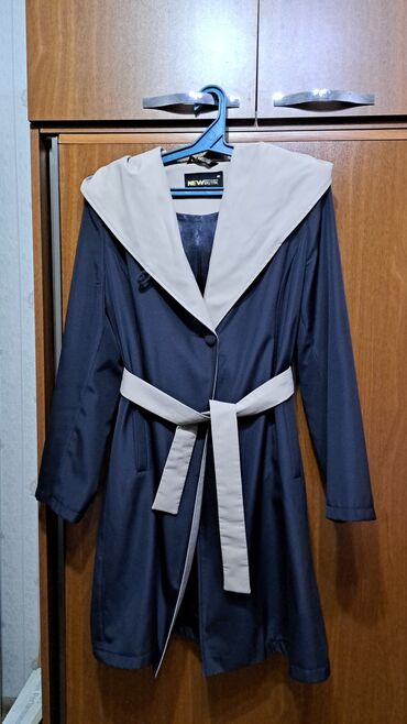 Satılı tezedi, 48 razmer - Rəng: tünd göy korpus, açıq bej kontrast detallar - Model: geniş V formalı, iri döşəməli kapüşon-effektli yaxa - Bağlama: ön hissədə bir düymə və eyni rəngli, çıxarılan ...