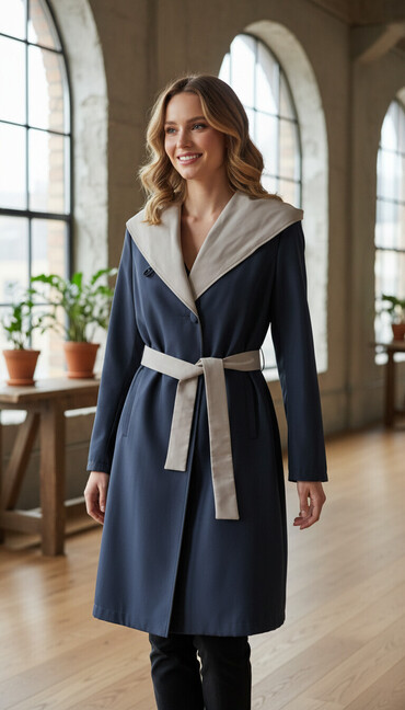 Masque brendi qadın yağmurluğu / trench - Rəng: tünd göy (navy) - Model: qısaqol, geniş haşiyəli-açıq yaxalı, dizə qədər uzunluq - Parça: yüngül, su itici sintetik material; iç hissə nazik astarlı...