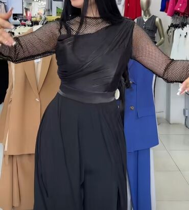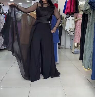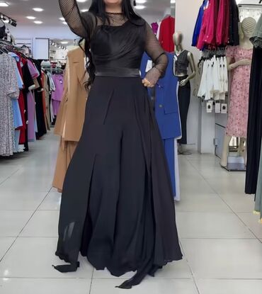 - Aşağı hissə geniş kəsimli palazzo tipli şalvardır; üzərində ayrılan, yüngül şifon qat pelerin kimi açılaraq ətək təsiri yaradır.