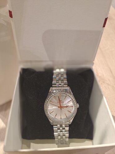 Hediyyelik Gümüşü rəngdə, metal kəmərli və dəyirmi formalı qadın qol saatı. Saatın siferblatının ətrafı kiçik, parıldayan daşlarla bəzədilmişdir. Saatın içərisində dəqiqə və saat göstəriciləri, eləcə də bir saniyə göstəricisi mövcuddur. Zərif və dəbli görünüşə malikdir, gündəlik istifadə üçün uyğundur.demek olar teze kimidir.