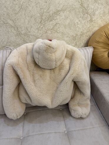 Qadınlar üçün süni kürk şuba/jaket - Rəng: açıq bej (krem tonları) - Material: yumşaq süni kürk, iç hissə parça astarlı - Model: qısa şuba tipli, düz kəsim, uzunqol - Yaxası: stand tipli (yüngül d...