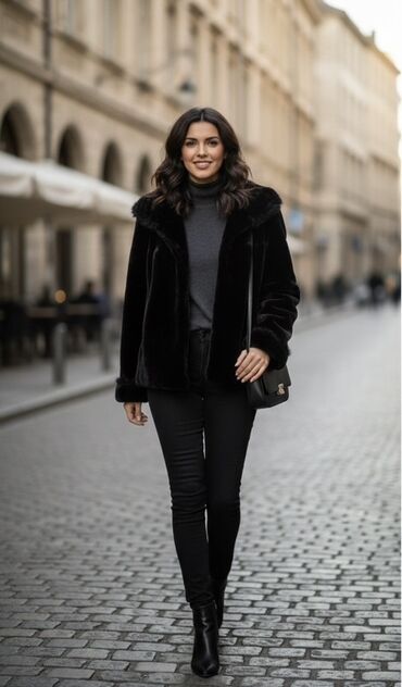 Şıq görünüş, minimal dizayn və rahat istilik axtaranlar üçün çox yönlü qara kürk jaket.