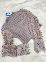 - Material: elastik trikotaj korpus, şifon və məxməri effektli aplikasiyalı durchsəffaf qollar