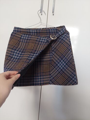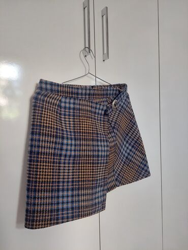 Qadın üçün qısa ətək – sarı-qəhvəyi və mavi rənglərin qarışıq “houndstooth”/xanacaqlı naxışlı parça. Model sarafan tipli örtmə (wrap) kəsimlidir: ön hissə üst-üstə bağlanır və beldə metal dairəvi halqa detalla bərkidilir. Payız-qış üslubuna uyğun qalın, toxumalı parça. Klassik və gündəlik kombinlər üçün ideal, dizdən yuxarı mini uzunluq. Rəng palitrası neytral tonlarla asan uyğunlaşır; çəkmə, golf və kofta ilə gözəl görünür.