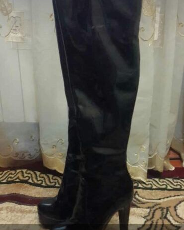 Qadın uzun çəkmə – qara, parlaq materialdan. Dizə qədər model, hündür nazik daban və ön platformalı baza. Daban təxmini 10-12 sm, platforma 2-3 sm civarı. Yan hissədə fermuarla bağlanır, dar siluetli. Şəhər stili və axşam geyimləri ilə uyğunlaşır, dizaynı klassik və zərifdir.