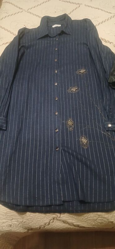 2) Tünd göy rəngdə: incə şaquli zolaqlı, tam ön hissə boyu düyməli, uzunqollu. Sağ ön tərəfdə muncuq və daş detallı çiçək aplikasiyaları mövcuddur.