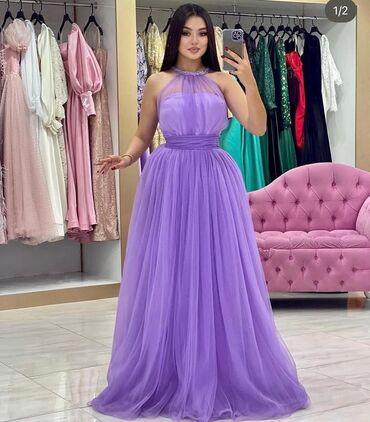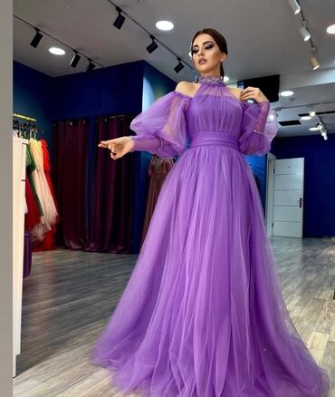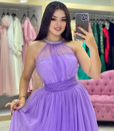 Yenidir, geyinilmeyib. Zərif ziyafət/gecə libası – bənövşəyi-lilac tonlarında - Model: Uzun, A-kəsim ətəkli, çoxqatlı tül parçadan. - Parça: Yüngül və axıcı şifon-tül kombinasiyası, parıltılı eff...