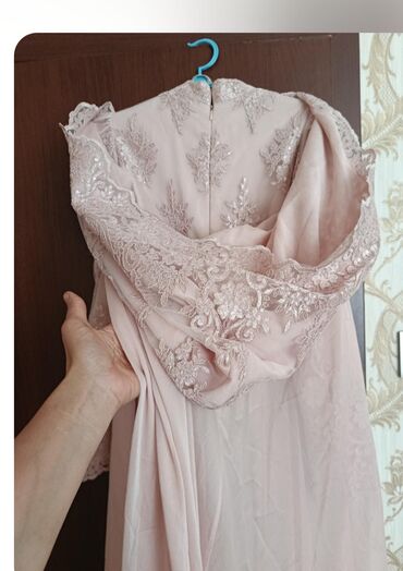 Zərif pudra rəngində uzun ziyafət/libas. - Üst hissə tamamilə naxışlı