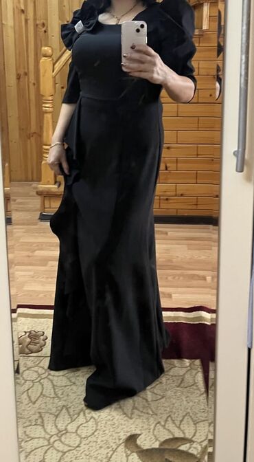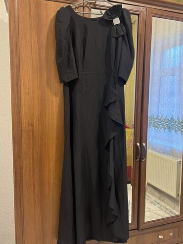 Qara ziyafət/libas - Klasik qara rəngdə, bədənə oturan siluet - Dizaynda düşümlü, enli “off‑shoulder” (açıq çiyin) yaxa xətti - Bel xəttini vurğulayan kəsim, düz ətək - Qalın və formaya saxlayan p...