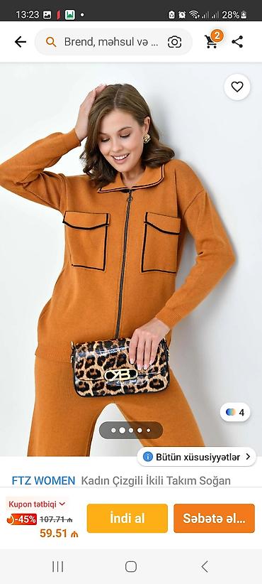 Qadın dəst – qəhvəyi rəngli, şık və rahat - Üst: Yüksək boğazlı, qolları geniş, barmaq keçirməli dizayn. Bədəni incə göstərən yüngül toparlayıcı kəsim. - Şalvar: Düz kəsim, rahat oturuş. Eyni tonl...