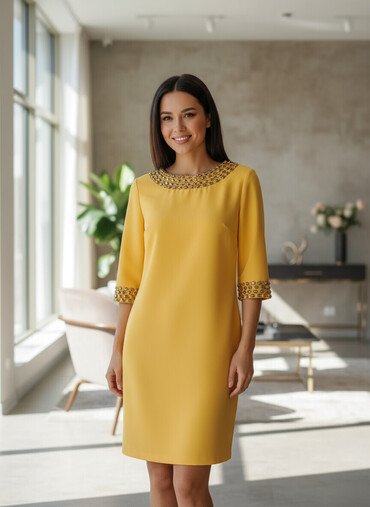 Zərif sarı rəngli uzun ziyafət geyimi. - Üst hissə: sıx işləməli, parıltılı daş və muncuq bəzəkləri ilə, qapalı yuvarlaq yaxa və qısa qollu kəsim. - Bel xətti: atlas və muncuqla işlənmiş 3D çiçək ...