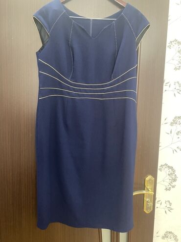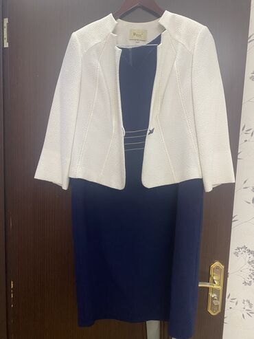 Ikinci el cox seliqeli Zərif iki parçalı dəst.Tünd göy rəngli diz boyu qolsuz paltar. Ölçü: etiketdə “Mona” brendi, ölçü 52 (etiketdə göstərilib). Rəng kombinasiyası: tünd göy paltar + ağ jaket.