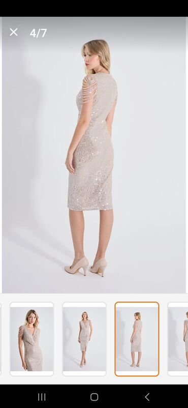 Qızılı rəngli, parıltılı kokteyl/ziyafət donu Əyin gözəl oturur. - Model: qolsuz, yuxarı hissəsi bədənə oturan, A-kəsim ətək - Boyun xətti: klassik yuvarlaq - Material: metallik parıltılı kumaş (şi...