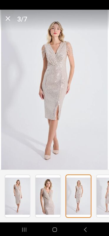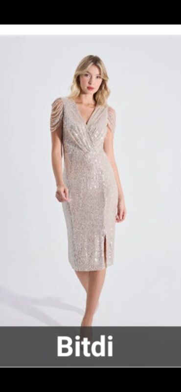 Payetli kokteyl donu - Rəng: şampan/bej tonları, tam səthdə xırda payet işləmələri ilə parlaq effekt - Siluet: beldən yığılmış, bədənə oturan midi uzunluq - Yaxa: kəsişən (wrap) V-yaxa, qaməti inc...