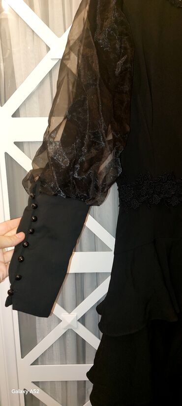 - Material: Qarışıq parça; qollar şəffaf şifon, əsas hissə sıx toxumalı parça