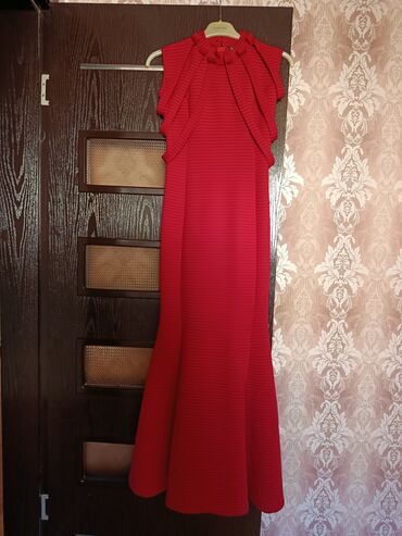 1 dəfə geyinilib. Təp təzədir. Ciddi alıcılar narahat etsin. Zərif qırmızı rəngdə uzun ziyafət geyimi. - Model: balıq kəsimə yaxın, yerə qədər uzunluq - Dekor: çiyinlərdə geniş volanlar; arxa his...