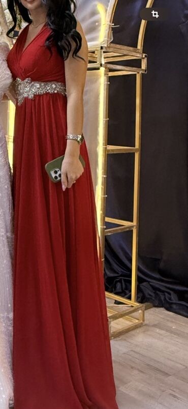 Qırmızı rəngli zərif ziyafət/libas - Model: Uzun, axıcı ətəkli, yüngül şifon görünüşlü parça - Yaxa: Dairəvi yaxa, incə daşlı/kristal bəzək kənarı - Üst hissə: Büzgülü bodi, bel hissəsində üç cərg...