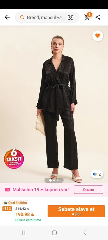 Qadın 2li dəst – parıltılı qara rəng - Tərkib: Parıltılı toxumalı kumaşdan pencək və şalvar, atlas effektli uzun manjetli bluz. - Rəng: Dərin qara, xırda simli-parıltılı effekt. - Stil: Axşam tədbi...