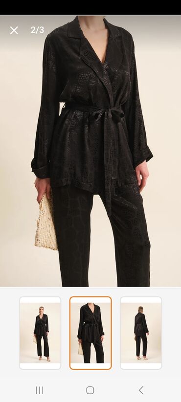 Qara zolaqlı kostyum dəsti, şalvar pencək, çox az istifadə edilib, parçası payız-qış üçün uyğundur - Rəng: qara, incə şaquli zolaqlı faktura - Tərkib: üç hissədən ibarət - Uzun, açıq fasonlu bl...