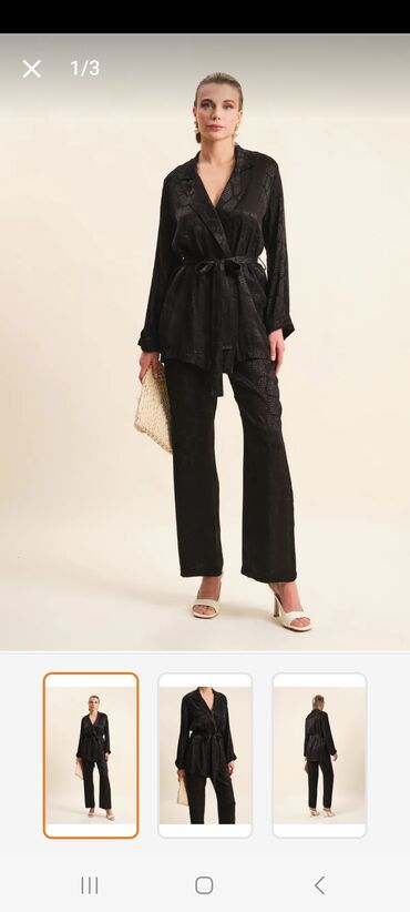 Qadın geyim dəsti – 3 fərqli model 1) Qara kombinezon - Rəng: qara - Model: qolsuz, yüksək yaxalı - Bel hissəsi rezinli, geniş balaqlı şalvar kəsimi - Arxadan fermuarlı - Yan cib detalları - Boyun...