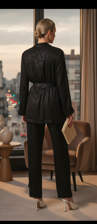 Bu dəst kəmərli uzunqol köynəkdən, həmçinin rahat şalvardan ibarətdir. Yüksək keyfiyyətli parçadan hazırlanmış bu dəst istirahət və ya zərif gecə geyimi üçün idealdır. Teksturalı səthi dəstə zərif bir görünüş verir, kəmər isə bədənə uyğunlaşma imkanı yaradır.baha alinib sekilde qiymet gorsenir