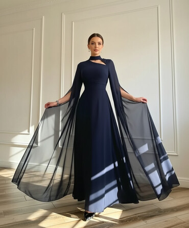 - Qollar: çiyindən aşağıya enən şifon pelerin tipli uzun “cape” qollar; yan tərəfdən açıq kəsikli, hərəkətə eleganlıq qatır